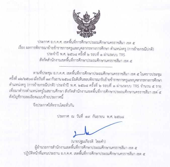 ประกาศ ผลการพิจารณาย้ายข้าราชการครูและบุคลากรทางการศึกษา ตำแหน่งครู (การย้ายกรณีปกติ) ประจำปี 2568 ครั้งที่ 2 ผ่านระบบ TRS