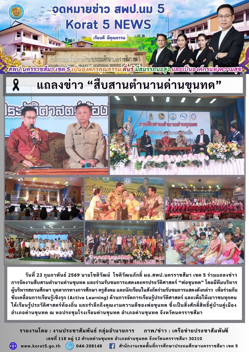 วันที่ 23 กุมภาพันธ์ 2569 นายโชติวัฒน์ โชติวัฒนภักดิ์ ผอ.สพป.นครราชสีมา เขต 5 ร่วมแถลงข่าวการจัดงานสืบสานตำนานด่านขุนทด และร่วมรับชมการแสดงละครประวัติศาสตร์ “พ่อขุนทด” โดยมีทีมบริหารผู้บริหารสถานศึกษา บุคลากรทางการศึกษา ครูสังคม และนักเรียนในสังกัดร่วมรับชมการแสดงดังกล่าว เพื่อร่วมกันขับเคลื่อนการเรียนรู้เชิงรุก (Active Learning) ด้านการจัดการเรียนรู้ประวัติศาสตร์ และเพื่อให้เยาวชนทุกคนได้เรียนรู้ประวัติศาสตร์ท้องถิ่น และรำลึกถึงคุณงามความดีของพ่อขุนทด ซึ่งเป็นสิ่งศักดิ์สิทธิ์คู่บ้านคู่เมืองอำเภอด่านขุนทด ณ หอประชุมโรงเรียนด่านขุนทด อำเภอด่านขุนทด จังหวัดนครราชสีมา
